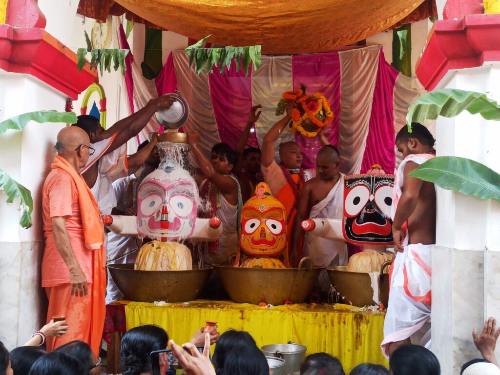 The ceremonial bathing begins with Vedic chants and the melodious kirtans of devotees. Priests pour the 108 pitchers of sacred water over the deities, each stream glistening like a cascade of divine nectar under the golden sun. This act is a sacred offering, where devotees surrender their hearts to Bhagwan Jagannath. As Jayadeva writes in Gita Govindam, “Thy form, O Jagannath, is the ocean of bliss, where the heart of the devotee drowns in love divine.” The water, infused with sacred herbs, flows over the deities, symbolizing the purification of the soul and the washing away of worldly attachments.