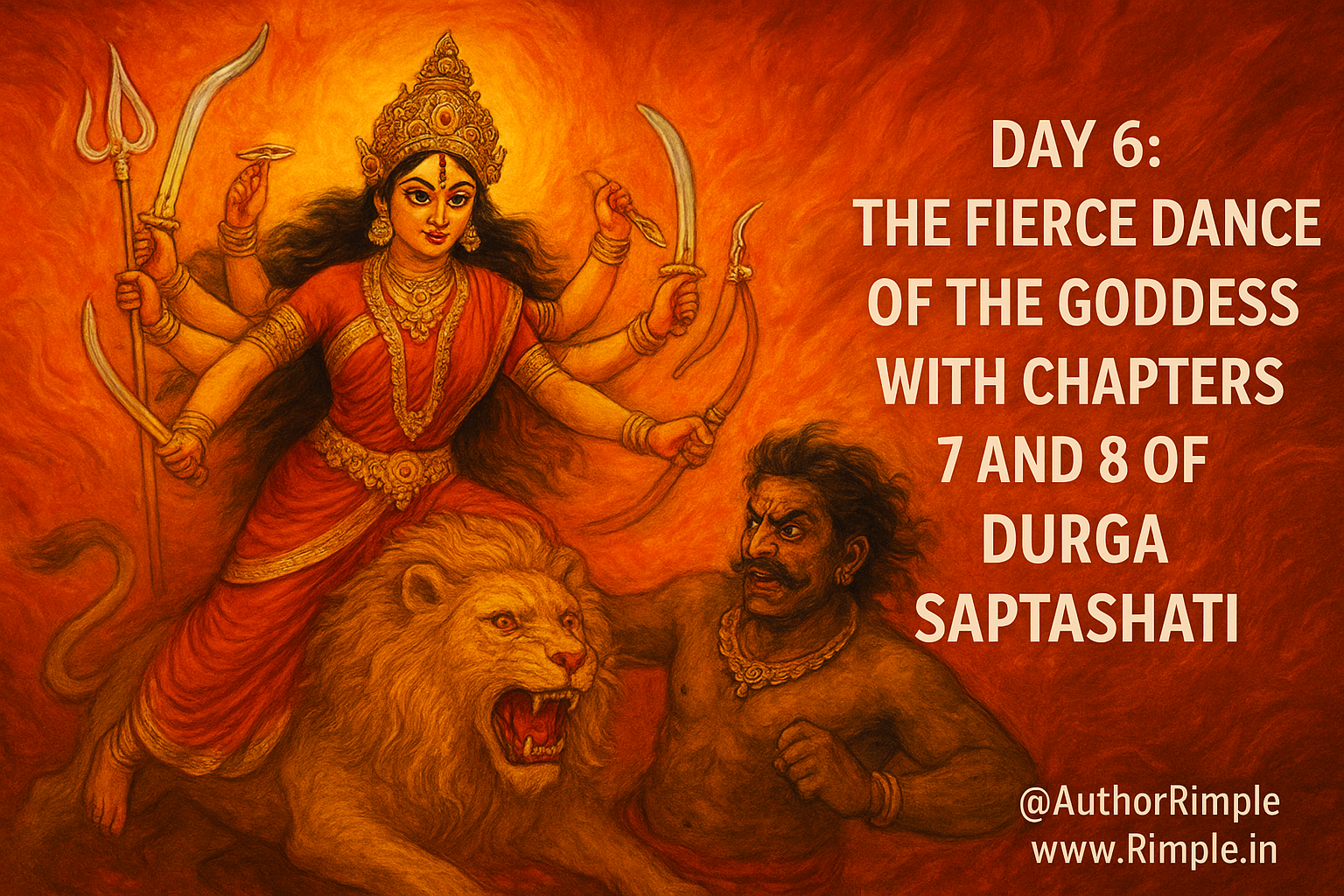 Dear devotee, as you chant the sacred verses of Chapters 7 and 8 on Day 6, picture Maa Durga as Chamunda, her fierce form radiant with power, her lion roaring as she vanquishes Chanda, Munda, and Raktabija. These chapters are not just stories—they are a testament to the Mother’s unyielding strength, her promise to destroy the demons of fear, anger, and ignorance in our lives. With every word you recite, let bhakti bloom like a lotus in your heart. Feel her power surging through you, her love healing your soul. She is the mother who fights for her child, no matter how fierce the battle.