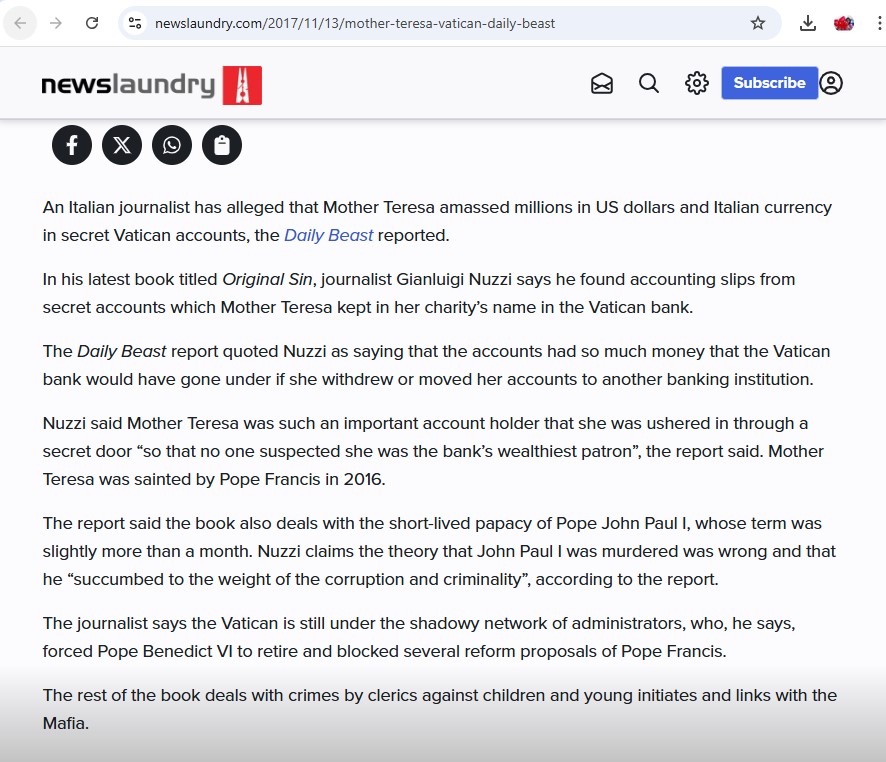 https://www.newslaundry.com/2017/11/13/mother-teresa-vatican-daily-beast - Details of how the Vatican rushed her sainthood while ignoring all criticisms: